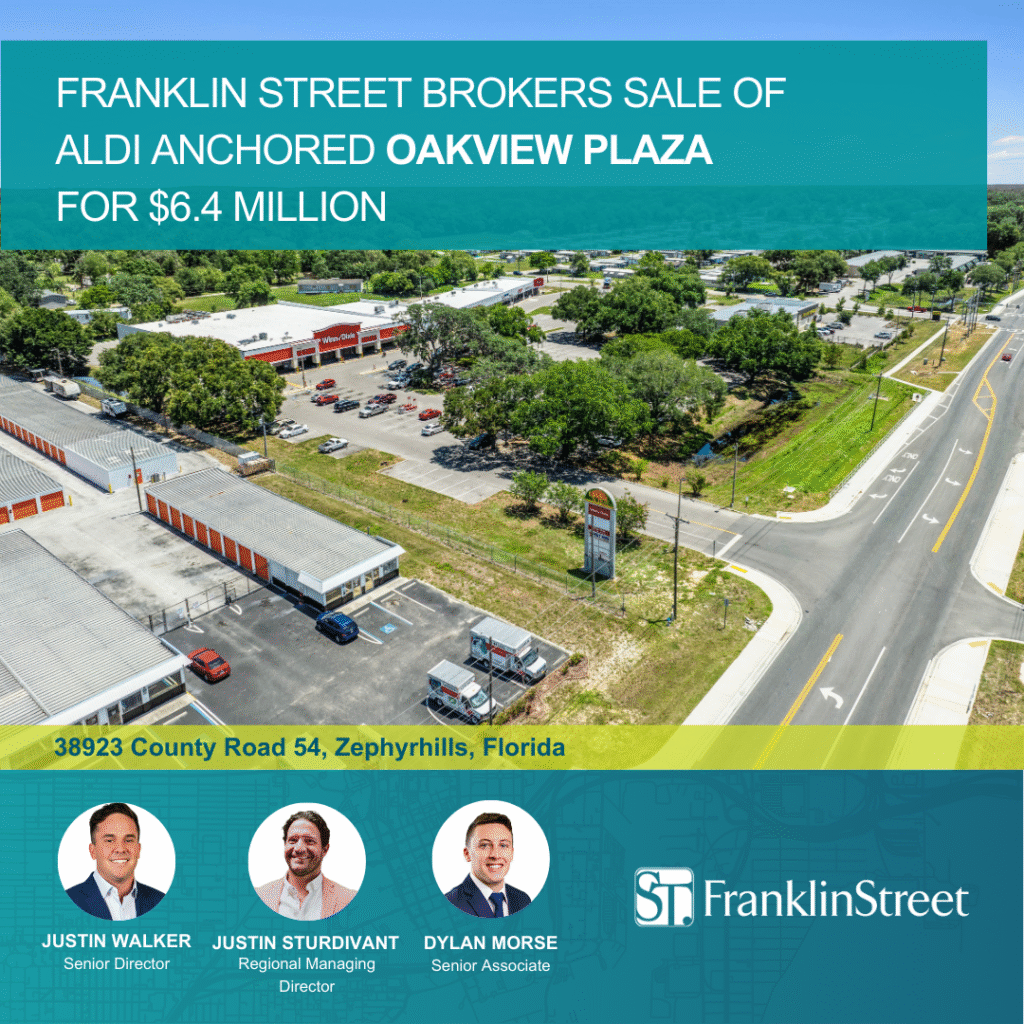 Franklin Street announced it has brokered the sale of Oakview Plaza, located at 38923 County Road 54 in Zephyrhills, Florida, for $6.4 million. Franklin Street represented the seller, Merrimac Ventures, a prominent South Florida-based real estate development firm led by Dev and Nitin Motwani. Merrimac Ventures has completed more than $3 billion in real estate projects to date and manages an active pipeline exceeding $3.7 billion with signature developments including the Waldorf Astoria Private Residences in Pompano Beach, Bungalow East in Fort Lauderdale Beach, and the Four Seasons Hotel & Private Residences in Telluride. New York based New Hyde Park Fruit Corporation was the buyer.