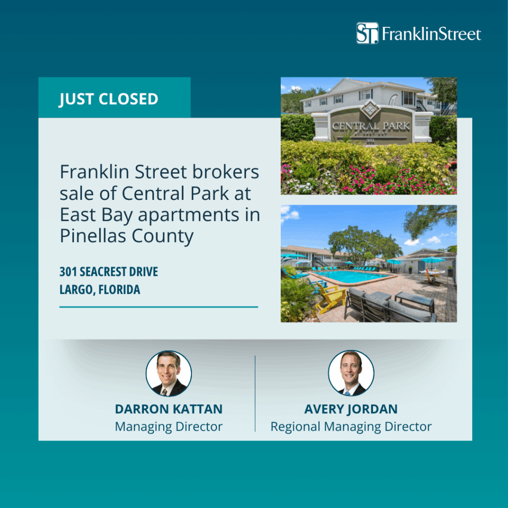 Franklin Street announced it has successfully brokered the sale of Central Park at East Bay located at 301 Seacrest Drive in Largo, Florida. The deal continues a trend of increasing transaction activity in Central and Southwest Florida following five other value-add multifamily sales executed year-to-date by the same brokerage team. Franklin Street represented both the buyer, Whitestone Capital and seller, ROI Capital, in the transaction.